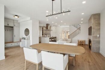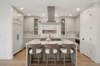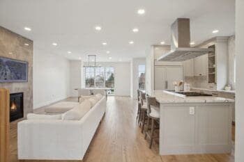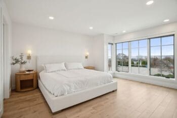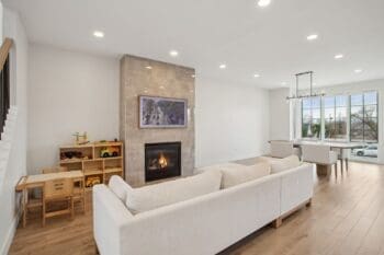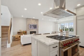 Inside, soaring nine-foot ceilings and expansive Pella windows flood the space with natural light, creating an inviting atmosphere. The open-concept main level features white oak hardwood floors, elegant marble surfaces, and a chef-inspired kitchen with top-of-the-line SubZero/Wolf appliances—perfect for both intimate gatherings and grand entertaining.