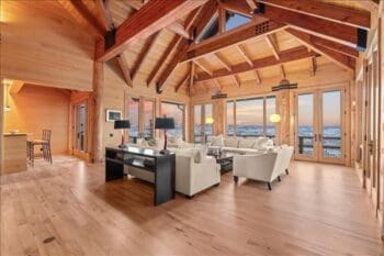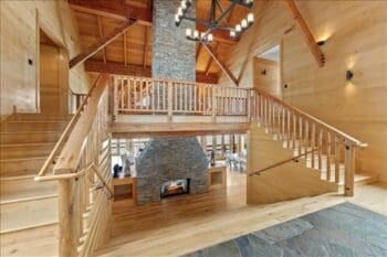 The spacious great room impresses with its vaulted wood ceilings, exposed beams, and a magnificent double-sided stone fireplace, creating a warm and inviting ambiance. Ideal for hosting gatherings, the open floor plan effortlessly flows from one room to the next. Downstairs, a generous family room provides ample space for relaxation and entertainment.