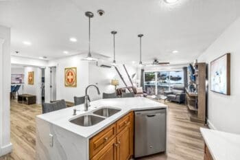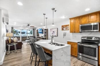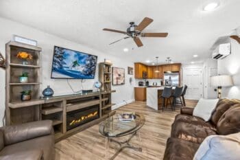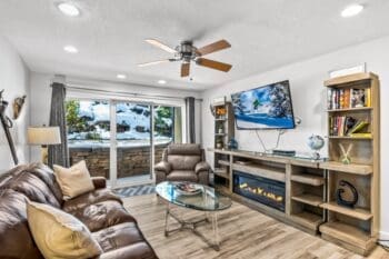 Conveniently positioned on the first floor of the inn, this condominium offers a delightful walkout patio that provides easy access to the courtyard and hot tub. The interior is tastefully furnished, ensuring utmost comfort throughout. The living room boasts ample seating, while the bedroom features two queen beds, accommodating a restful night’s sleep. Owner storage is available to securely house your personal belongings when you are away.
