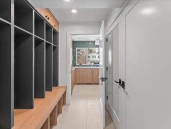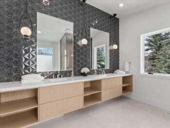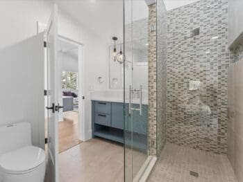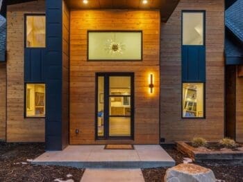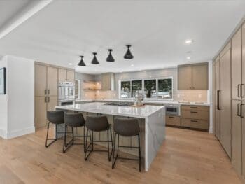 Interiors are graced with elegant hardwood floors, flawless tile detailing, and a kitchen decked out with top-of-the-line Thermador appliances. The home occupies a spacious .28-acre plot, freshly landscaped both at the front and rear. Its commanding street presence is magnified by an artful blend of cedar and metal sidings.