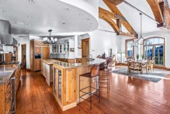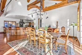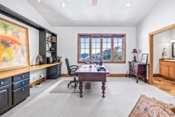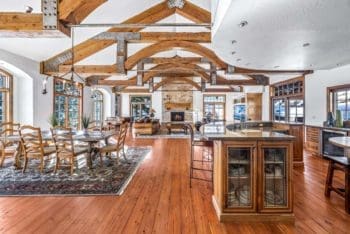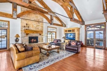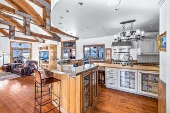 The Great Room serves as the perfect hub for entertaining, featuring a spacious living room, dining room, and kitchen. Framed by expansive rough-cut beams, this space boasts floor-to-ceiling panoramic windows and a magnificent stone fireplace. The chef’s kitchen is a culinary dream, equipped with a bar top, a full walk-in pantry, and an adjacent laundry room. Enjoy year-round comfort with the radiant heat flooring system, complemented by backup forced air heat furnaces, and stay cool with the three zones of air conditioning. The oversized 3-car heated garage includes an unfinished loft, providing additional storage space.