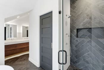 Anyone arriving at the front door is greeted first by light—a cascade of it pouring through a three-story wall of south-facing windows. As you step inside, the dramatic glass-and-walnut staircase becomes the centerpiece, a sculptural invitation to explore the home. Beyond it, panoramic mountain views stretch across the protected open space, a reminder that nature is always part of the experience here.