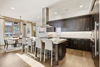 Mornings begin in the gourmet kitchen, where premium appliances, custom cabinetry, and an oversized island invite everyone to gather before heading out for a day on the slopes. Evenings unfold with equal ease, as friends drift from the great room to the deck, watching the alpenglow settle over the snow-covered trees.